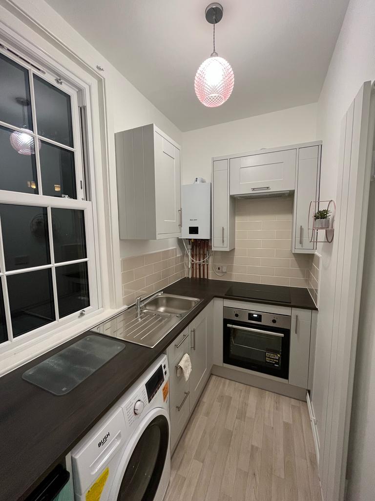 The newly fitted kitchen boasts a modern design with a range of floor and wall units, built-in oven, separate hob, sink with drainer, washer/dryer, and under-counter fridge/freezer—everything you need for comfortable living.