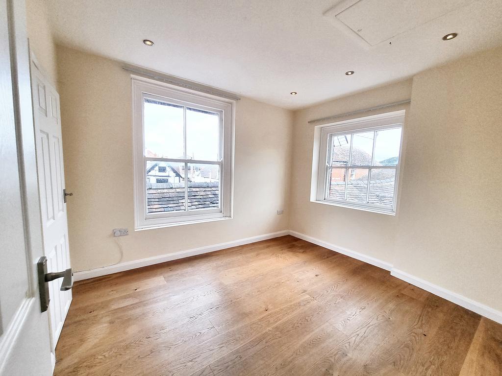BEDROOM 2 with wood laminate floor, two sash windows overlooking the market square, exposed beams, radiator and shelving.