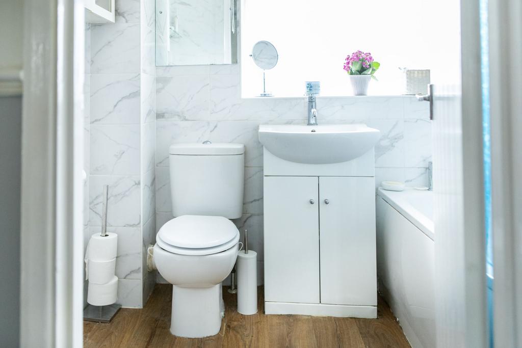 * Downstairs WC with vanity sink unit. Tiled floor.