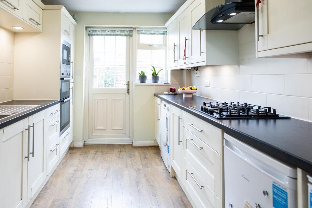 * Kitchen with integrated double oven and microwave. Space for fridge, freezer, washing machine and tumble dryer. Door to garden.