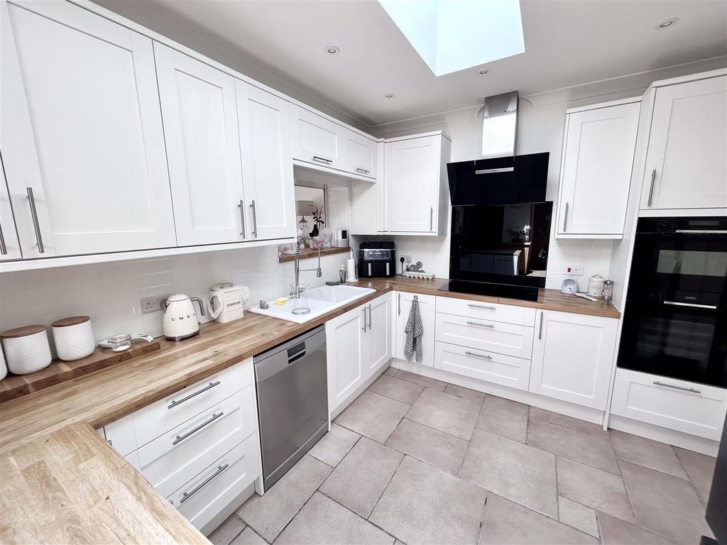 Kitchen - 9' 9'' x 24' 9'' (2.97m x 7.55m) - Tiled flooring. Modern-fitted kitchen with ceramic sink drainer, oak worktops, electric hob and double oven. Room for an American fridge freezer. Walk-in Pantry. Two Double glazed skylights.