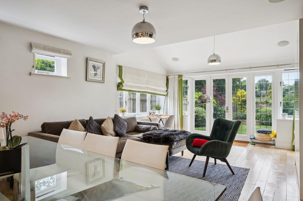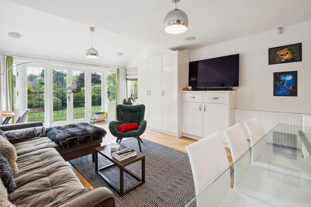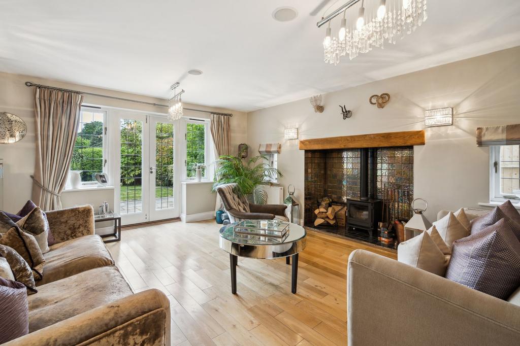 The rear living room boasts a wood-burning stove and French doors to the garden. The kitchen/diner opens to a family area with built-in storage and garden views.