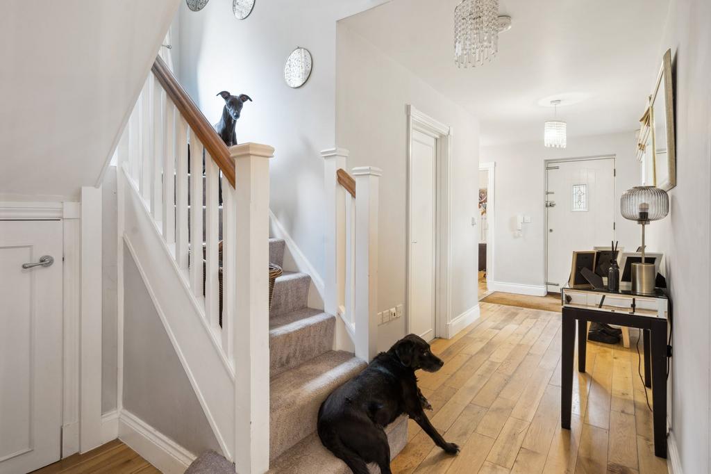 Inside, a spacious entrance hall leads to two reception rooms, a large kitchen/diner with quality walnut fronted units and integrated appliances, utility room, shower room, and storage. One front reception connects to a bedroom and shower room—ideal for a nanny suite.