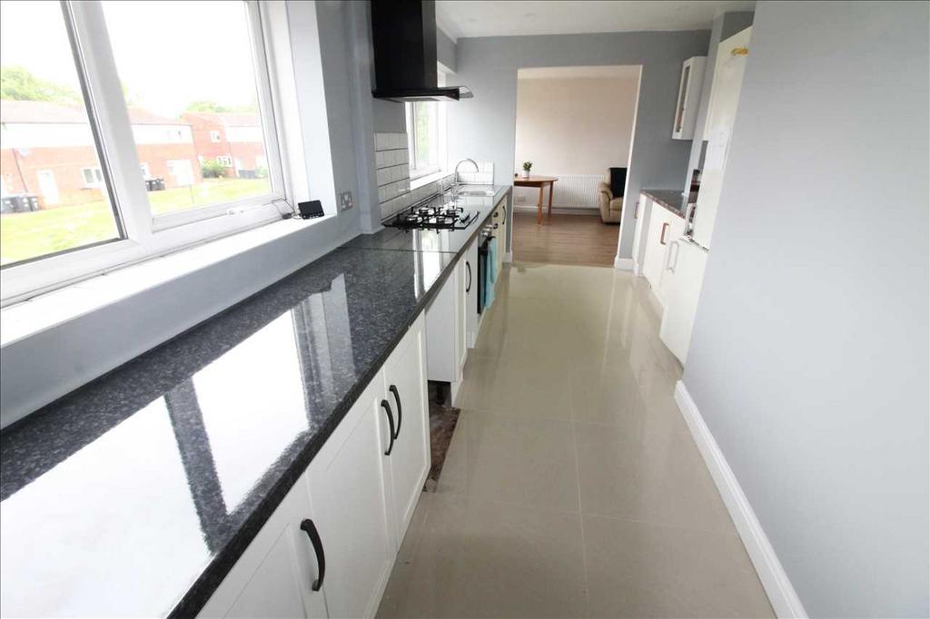 Fitted with a range of base and eye level units with worktop surfaces. Stainless steel single drainer sink unit with cupboards under. Built in gas hob and electric oven with extractor hood over. Plumbing for washing machine. Fridge/freezer. Two UPVC double glazed windows to front aspect. Wall mounted gas combination boiler. Inset spotlights. Tiled floor with underfloor heating. Tiling to splash back areas.