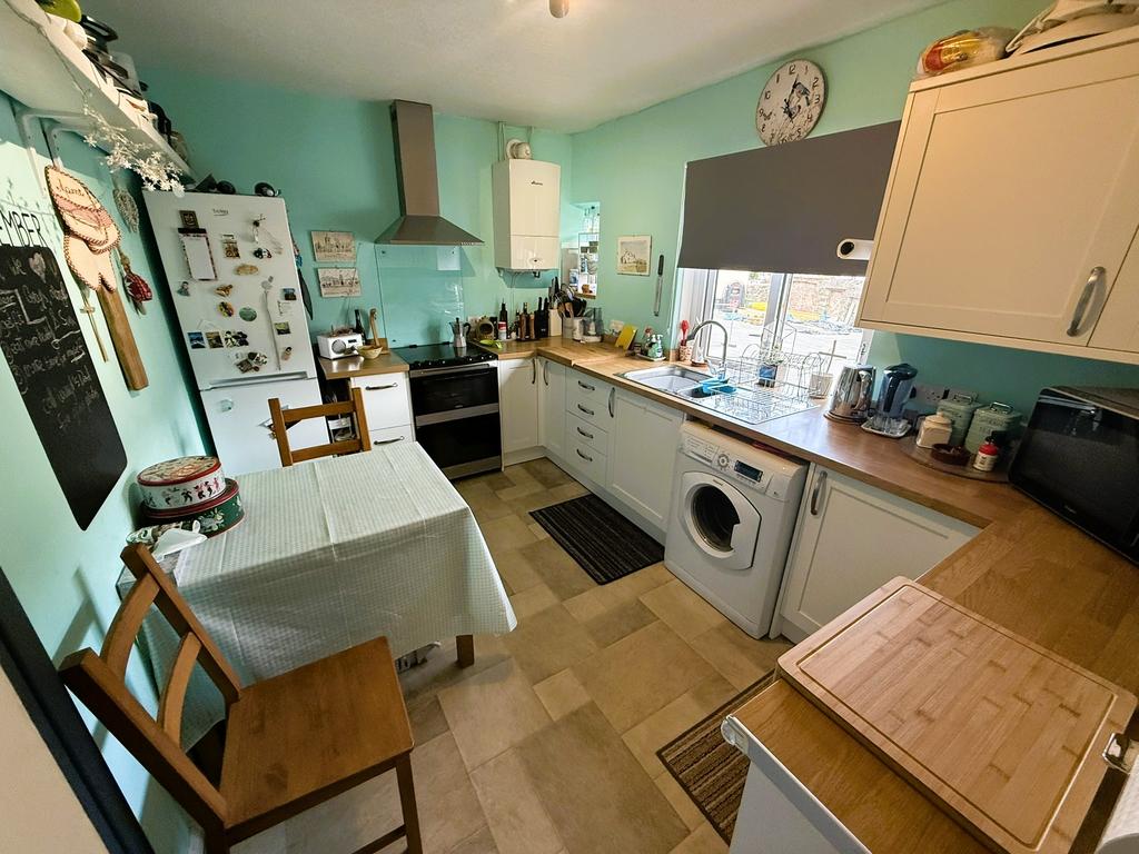 Base and wall units, appliance spaces, glass fronted display unit, electric cooker point, 1 1/2 bowl and single drainer sink unit with mixer taps over, plumbing for automatic washing machine, radiator, Worcester gas fired central heating boiler and two-double glazed windows to front.