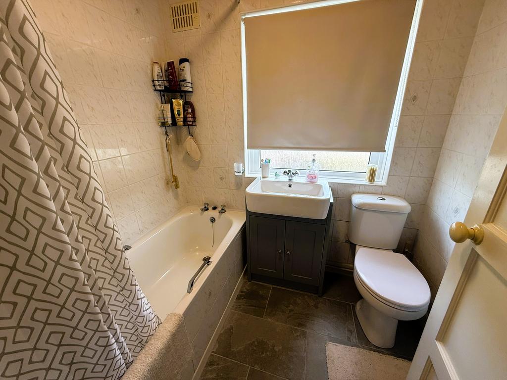 Panelled bath with ‘Triton’ shower over, tiled walls and floor, vanity wash and basin, double glazed window to rear, low level flush WC and radiator