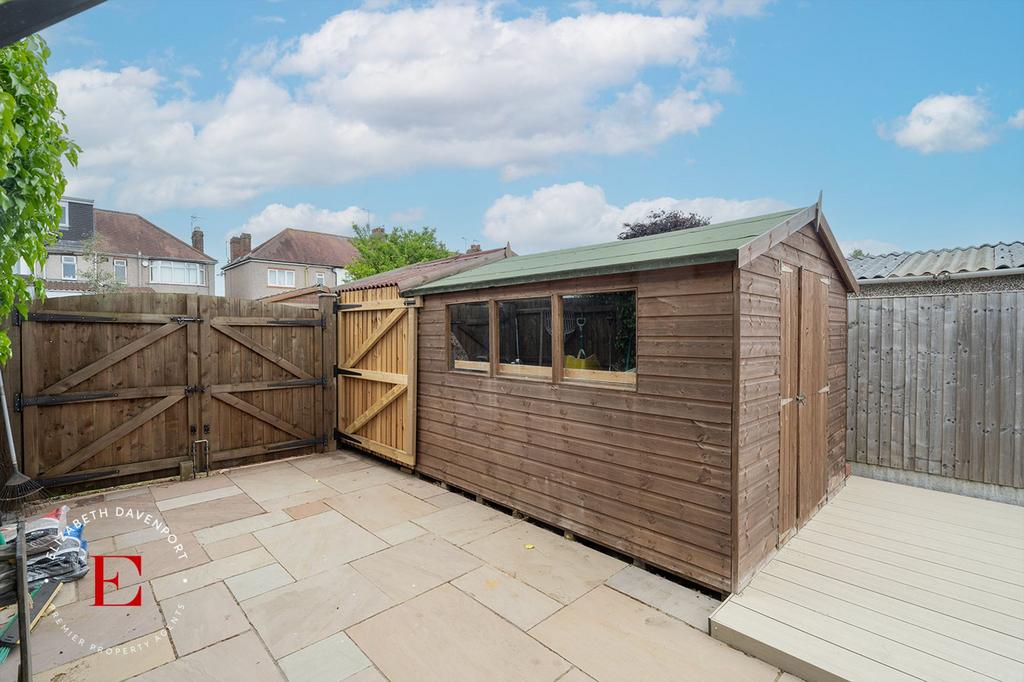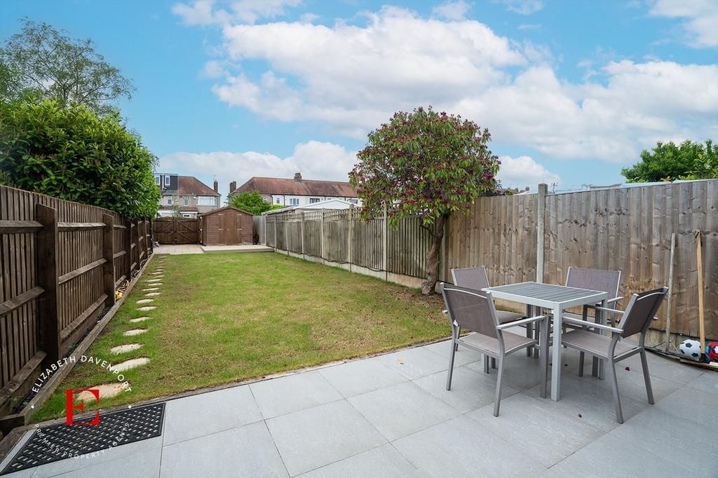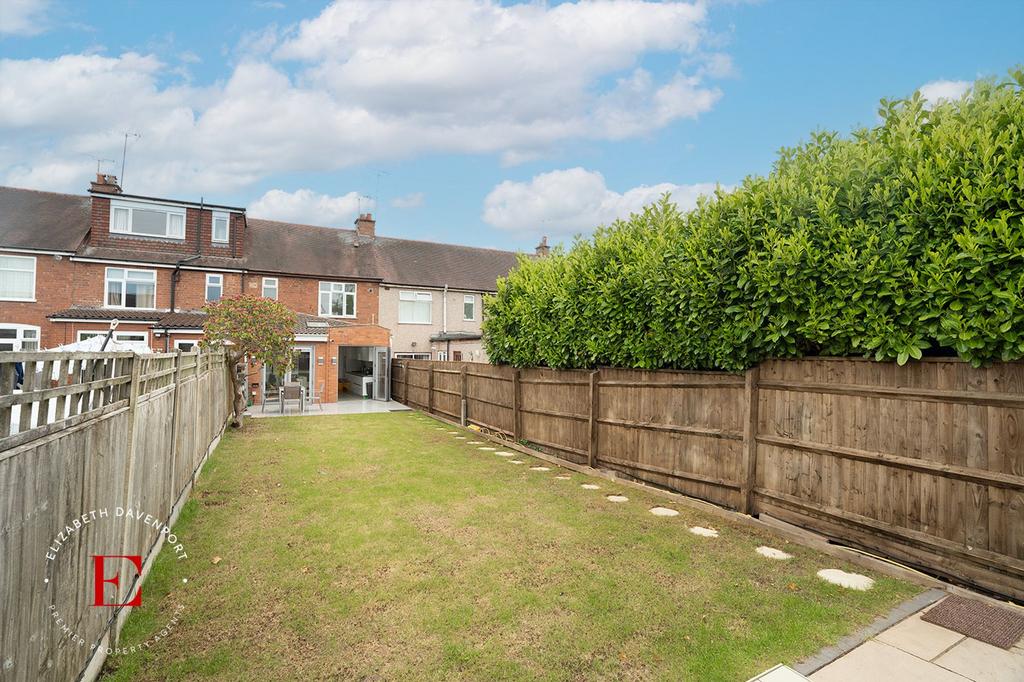 A well presented rear garden with a tiled patio area with the remainder of the garden being laid to lawn with surround boundary fencing and a garage. To the rear of the garden is a private road which is securely gated.