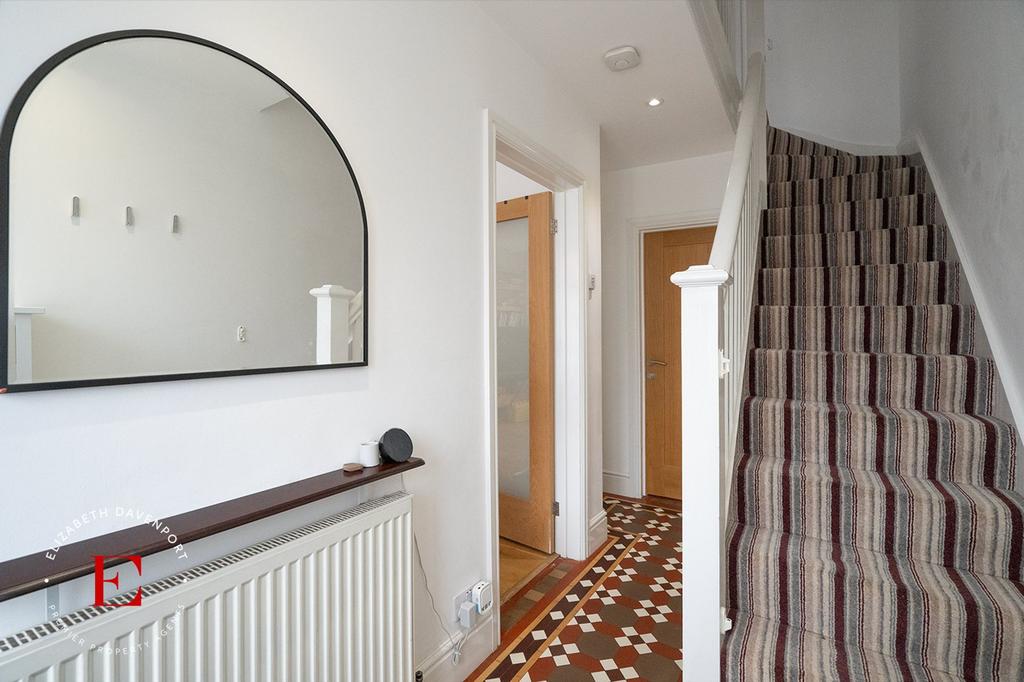 A bright and airy entrance hall having a staircase with balustrade rising to the first floor, solid oak front door, under stairs clever closet storage, original Minton tiled flooring, central heating radiators, power, and LED spotlights.