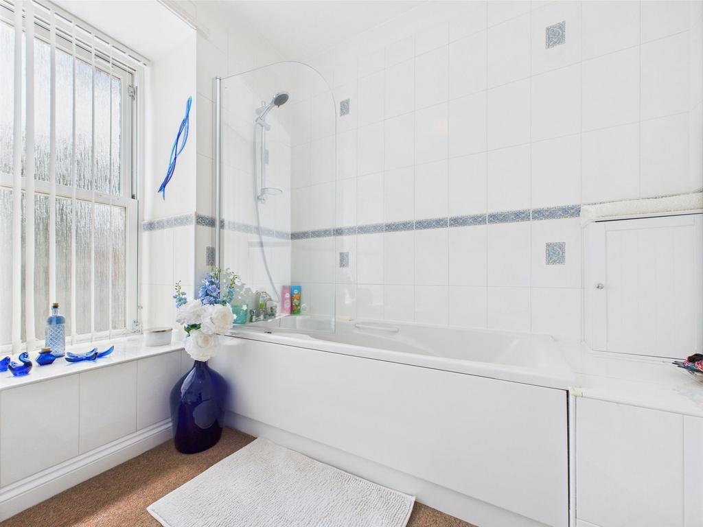 EN-SUITE BATHROOM A spacious bathroom with a white suite. Bath with shower fitment and glass splash screen. Pedestal wash hand basin plus close coupled W/C. Part tiled walls. Heated ladder towel rail radiator. Striplight with shaver point. Double glazed window.