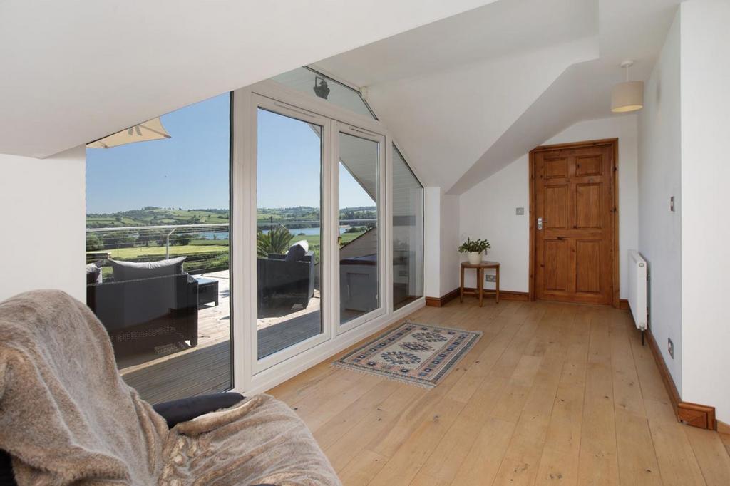 Oak flooring and double glazed French doors with side panels giving a lovely view south to the estuary and the hills beyond and accessing the large SUN DECK with stainless steel railing and superb views. Radiator.