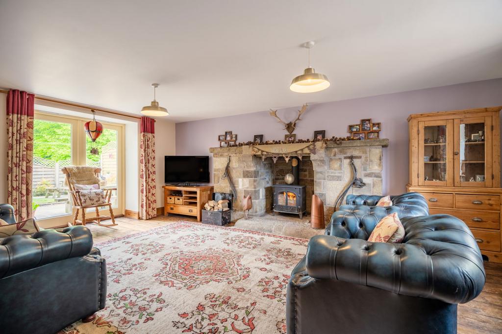 At the front of the home, a spacious lounge awaits, perfect for entertaining—featuring a striking stone fireplace with a log burner and large window and patio doors that bathe the room in natural light.