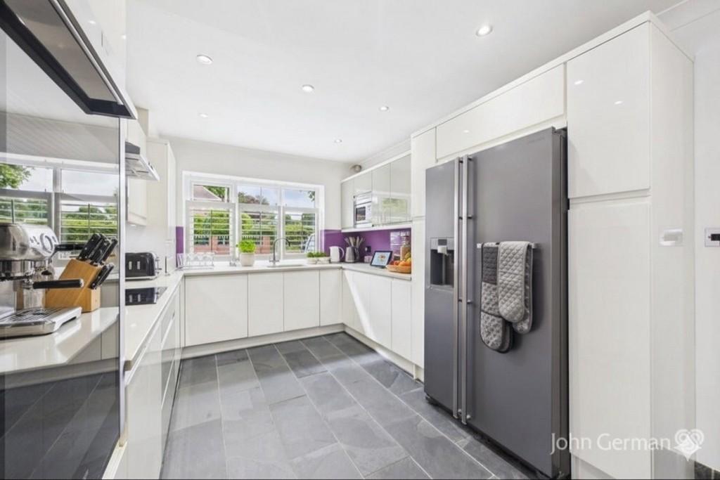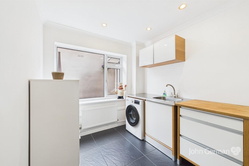 The ground floor hosts a large double Bedroom Three, which has uPVC double glazed windows to the front and side, and wood veneer laminate flooring. The modern fitted breakfast kitchen is a highlight, with two-tone high-gloss wall and base units, quartz worktops, and integrated Bosch appliances including a double oven, induction hob, dishwasher, and microwave. A separate utility room provides space for a washing machine and can also be used as a home office or a fifth bedroom.