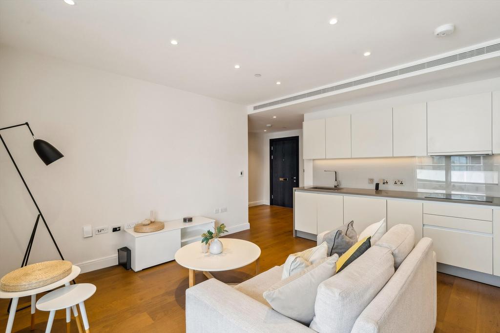 This gorgeous apartment is located on the 8th floor of a contemporary development next to Battersea Park. The flat comprises an open-plan kitchen and reception with sleek integrated appliances and wooden flooring, a double bedroom with built-in wardrobes, a modern bathroom, and a utility room. The living room and bedroom both have doors opening out to a south-west facing balcony. There is also the unique opportunity to purchase the next door apartment and amalgamate the two spaces, subject to freeholder's consent and planning permission.