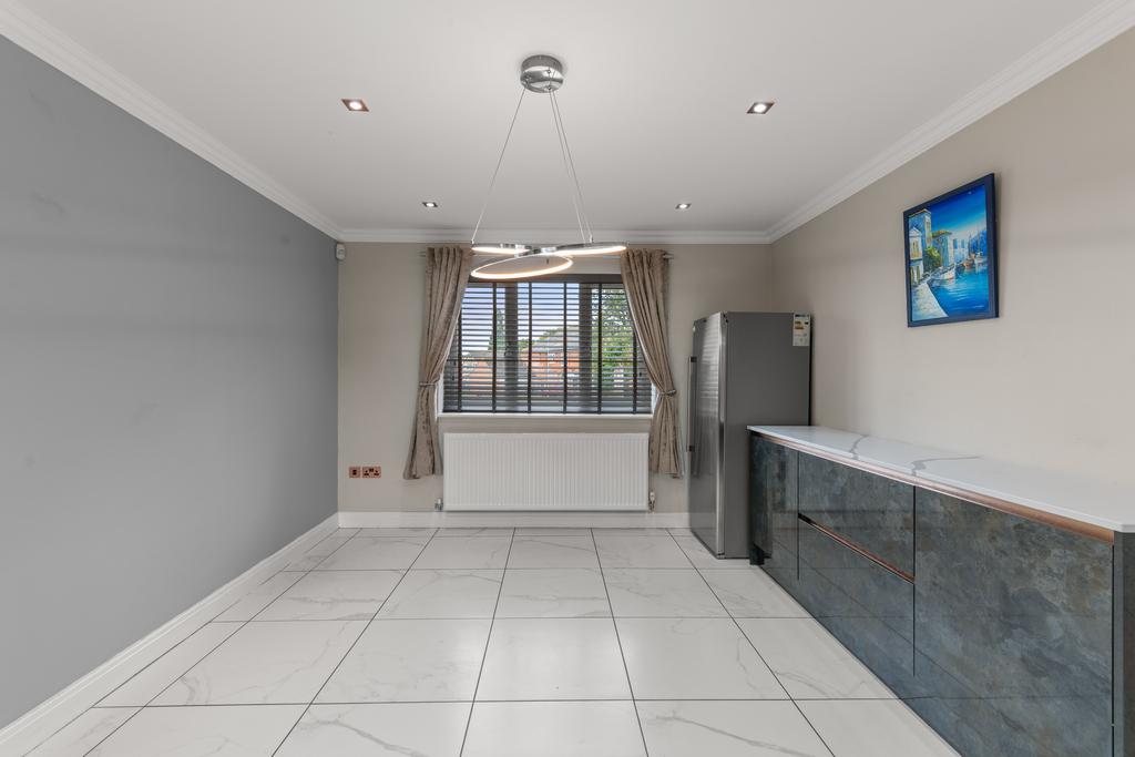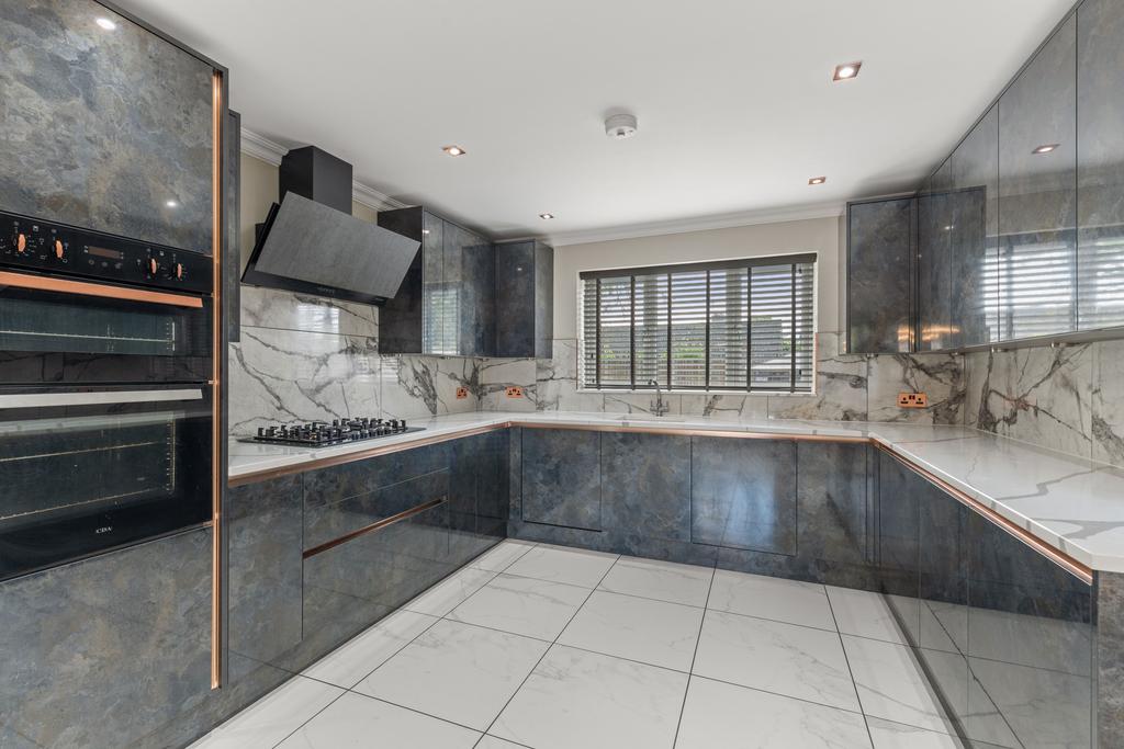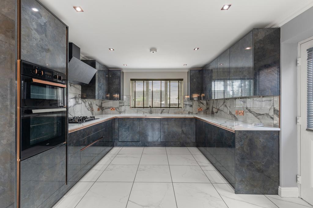 Having windows to front & rear elevations, part glazed door to side elevation, coved ceiling with inset ceiling spotlights, radiator, tiled floor and television aerial connection point. Fitted with a range of base & wall units with quartz work surfaces & tiled splashbacks comprising: undercounter sink with mixer tap inset to work surface, cupboard, integrated dishwasher & integrated automatic washing machine under, cupboards over. Work surface return with inset five burner gas hob, cupboards & drawers under, cupboards & extractor over, tall unit to side housing integrated electric double oven with cupboards under & over. Further work surface return with cupboards under, cupboards over. Further work surface with cupboards & drawers under, space for upright fridge/freezer to side.