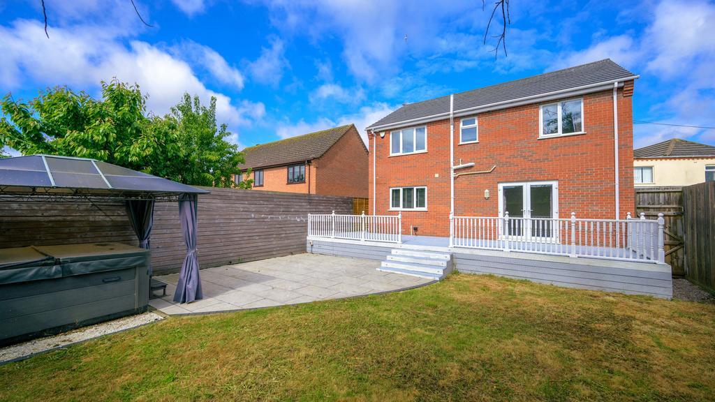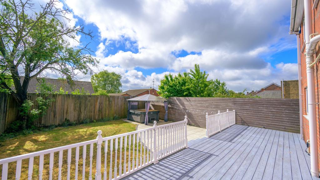 Being enclosed with access from both sides. Having a raised decked area with balustrading and steps down to a paved patio and lawned garden. There is also a hot tub with a pergola over.
