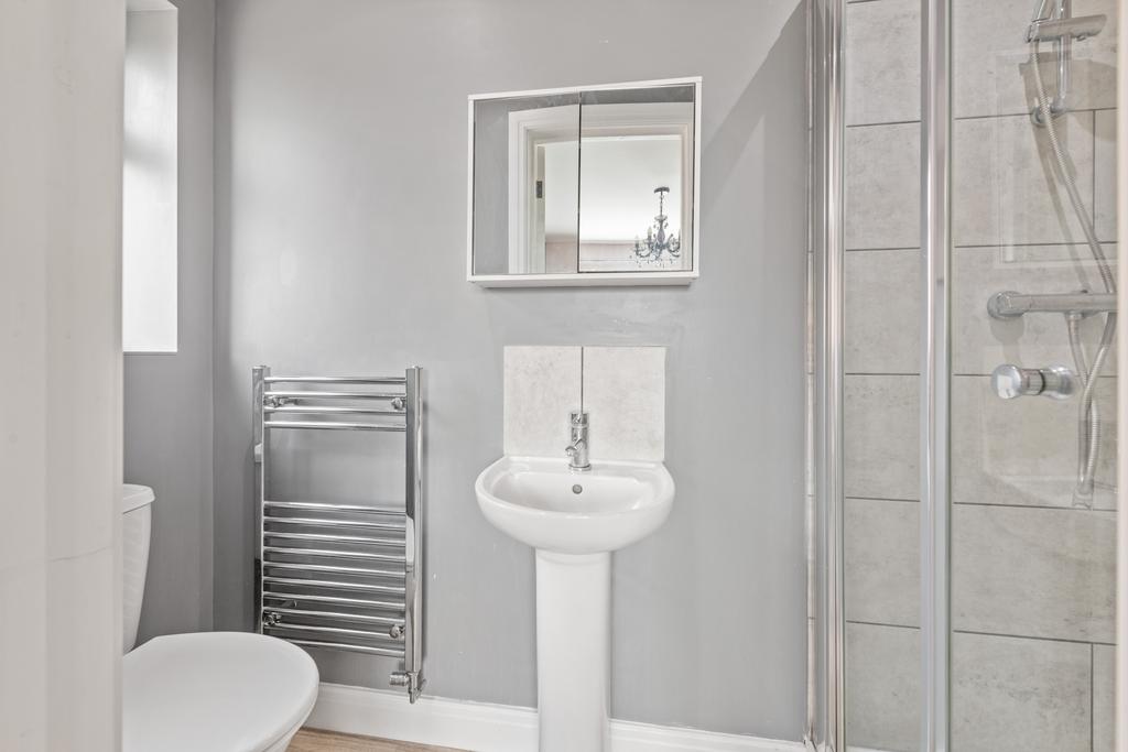 Having window to side elevation, heated towel rail, extractor, fully tiled shower enclosure with mixer shower fitting, close coupled WC and pedestal hand basin with tiled splashback.
