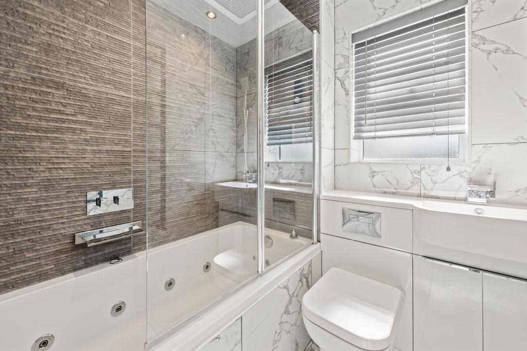 Having window to rear elevation, heated towel rail, tiled walls, tiled floor and extractor. Fitted with a suite comprising: Jacuzzi bath with mixer shower fitting & anti-splash screen over, hand basin inset to vanity unit with cupboard under and WC with concealed cistern.