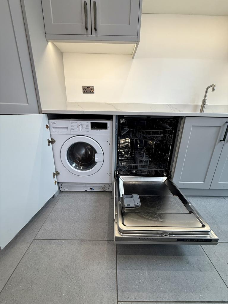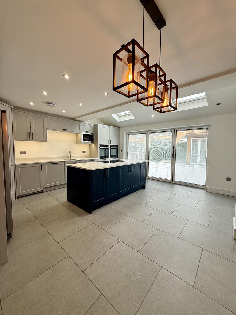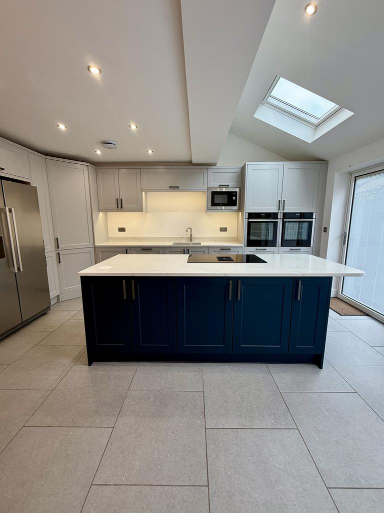The kitchen is huge in size with navy and cream shaker units, a fantastic kitchen island with plenty of worktop space and enough room for a dining table. Appliances are also included as below: