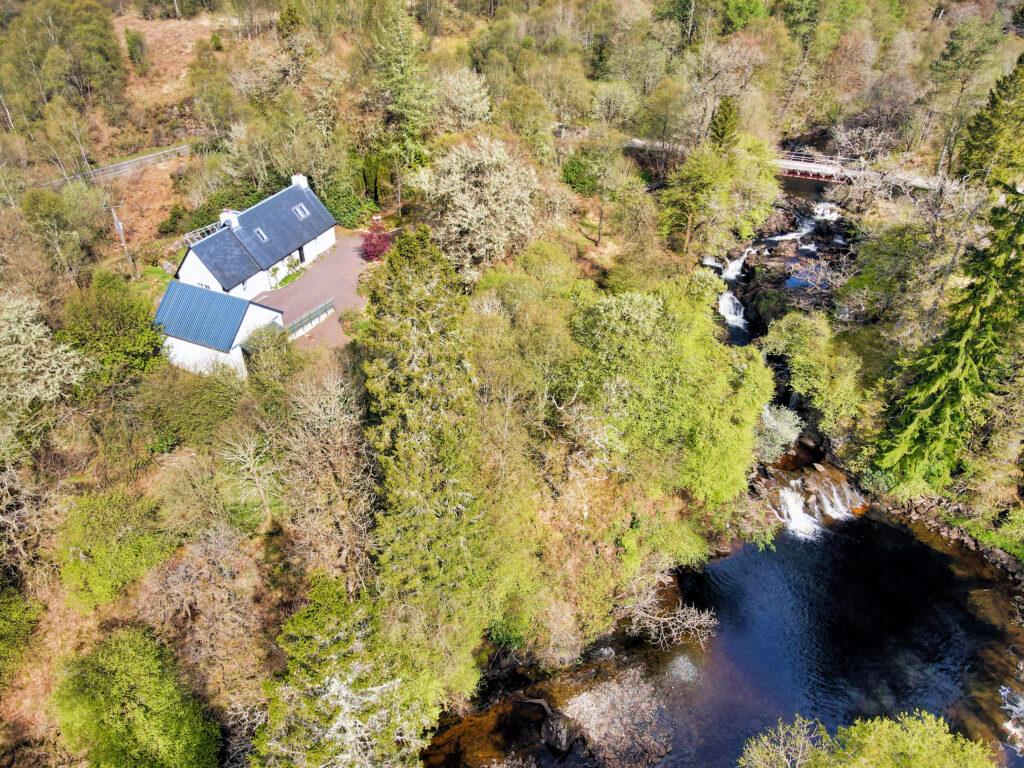The cottage and location are all about the great outdoors with a breathtaking waterfall and pool at the edge of the boundary, sweeping gravel driveway with parking for multiple vehicles, woodstore, mature well stocked garden with a variety of established Trees, shrubs and annual flowering perennials such as Acer, Azalea and Hostas. Gravel paths meander around the plot of approximately half an acre and there are multiple vantage points including two south facing patio and BBQ areas. While the garden area is enclosed by a stock fence there are further grounds around the cottage that are left to nature that could be developed further. Please note that no river rights are included in the sale.