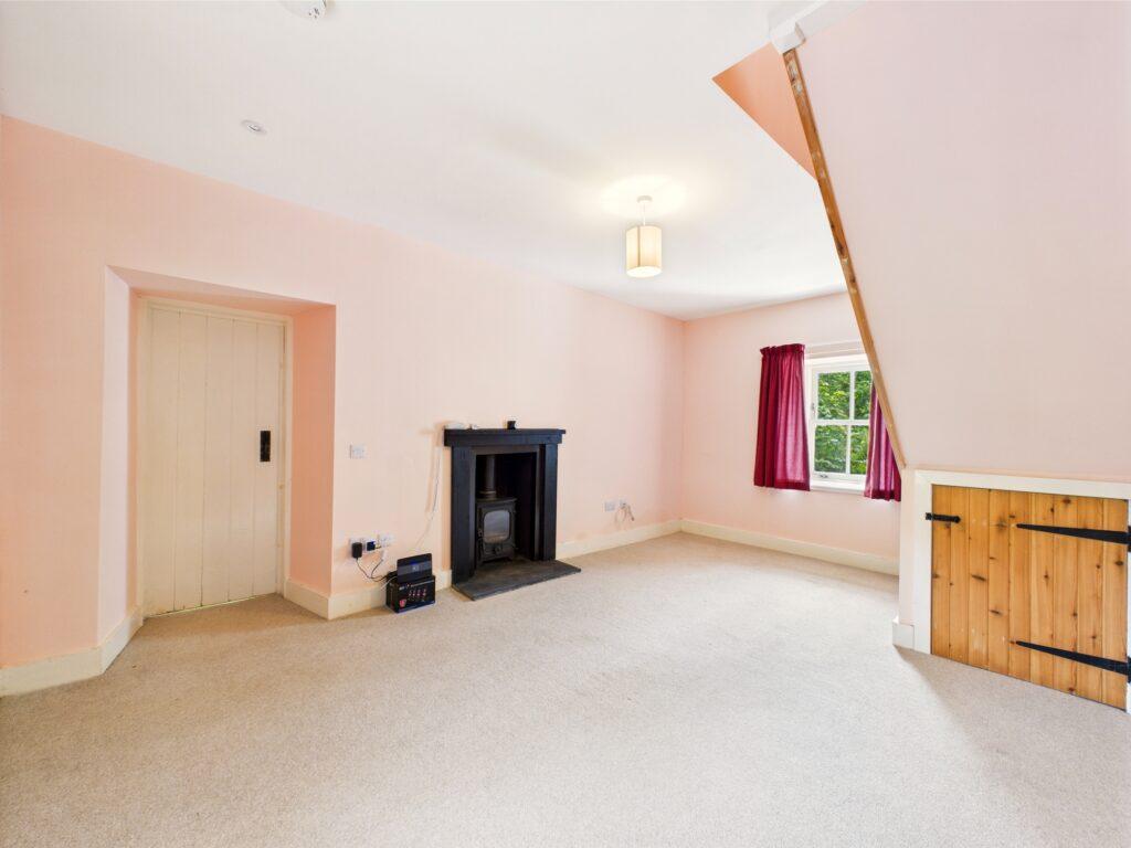 Good size room with dual aspect views to the front and rear. Feature multi fuel stove set on a slate hearth, carpeted, understairs storage and central heating radiator.