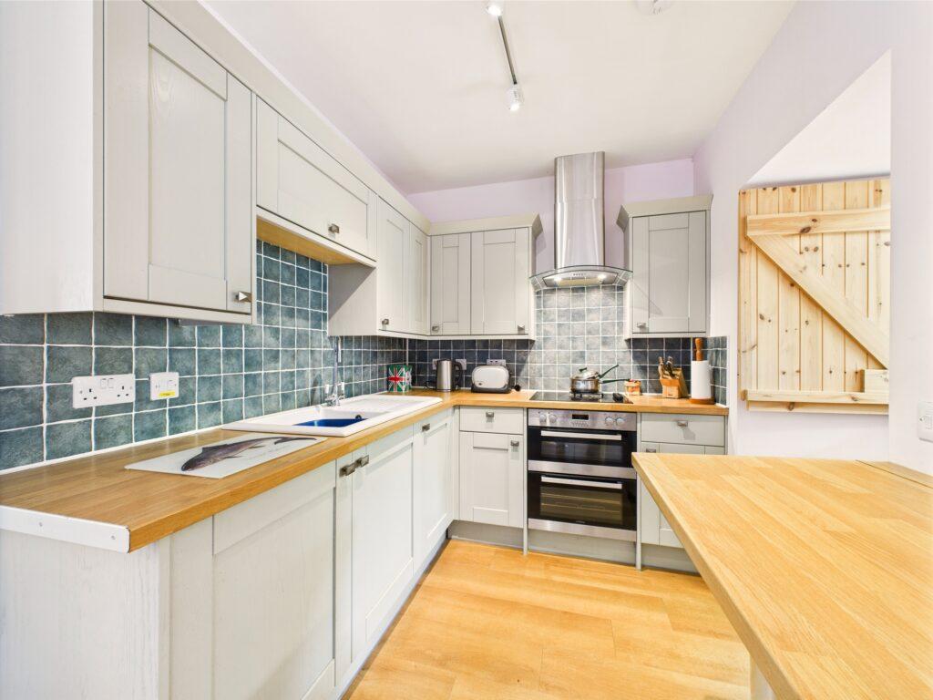 Very handy room when returning from country walks with ample coat and boot storage. Matching sage green base units with pewter handles, Belfast sink set in the solid oak worktop, green tiled splashbacks, fridge freezer space, views of the rear, engineered oak flooring, central heating radiator, space and plumbing for white goods. Composite door leading out to the drying green and south facing patio.