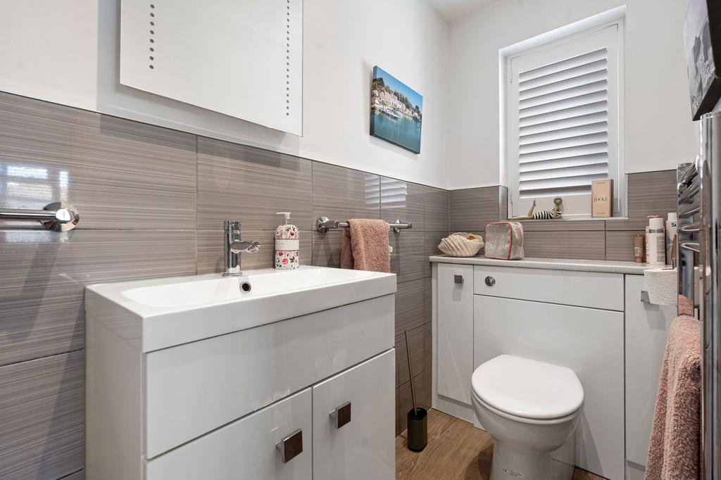 Shower cubicle, wash hand basin and vanity cupboard, low flush WC, heated towel rail, opaque pattern double glazed window in uPVC frame to side.
