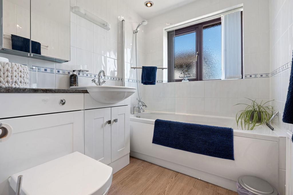 Panel bath with shower fitment and glazed shower screen, wash hand basin with vanity cupboard and low flush WC, radiator, opaque patterned double glazed window in uPVC frame to front.