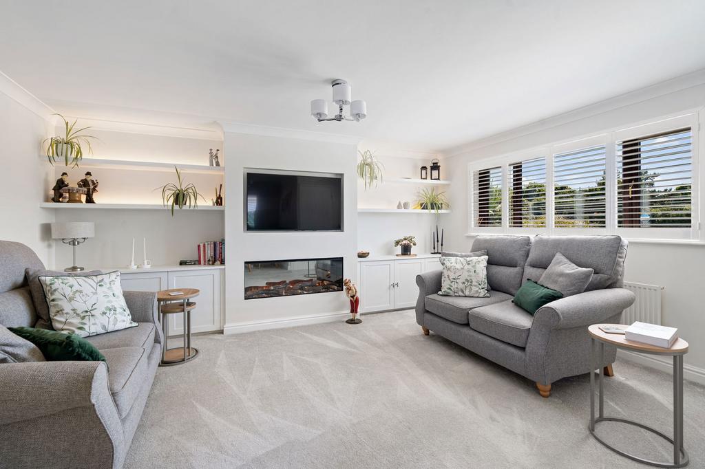 A light dual aspect room with double glazed windows in uPVC frame to front and side with built in shutters. Feature electric flame effect fire with built in cupboards and shelving over to each side, space for wall mounted TV above, two radiators, glazed door to hall and arch to: