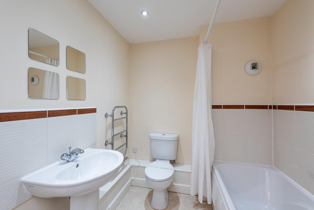 Three piece suite comprising, panelled bath with shower attachment over, low level WC and wash hand basin. Heated towel rail, inset spotlights, tiled splash backs and extractor.