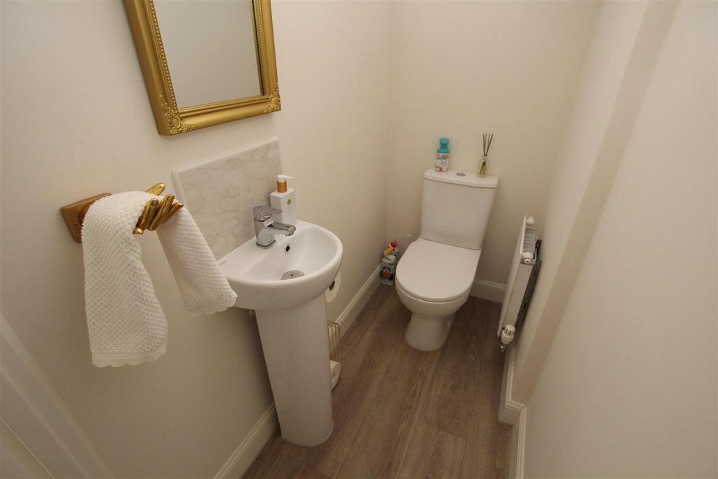 Cloaksroom - Two piece suite comprising low flush wc, pedestal wash basin and radiator.
