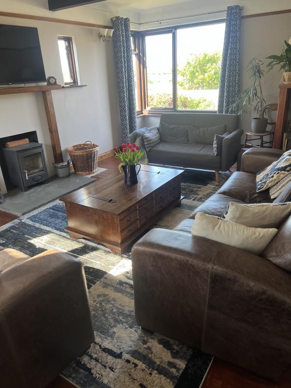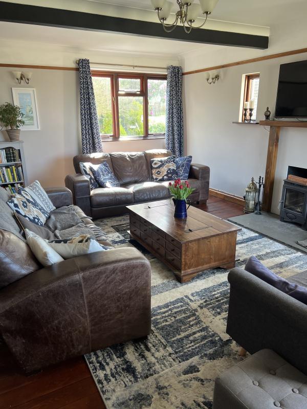Large triple aspect room with panoramic views of the village and countryside, views out to sea. Exposed wooden flooring with wood burner providing a central focal point.