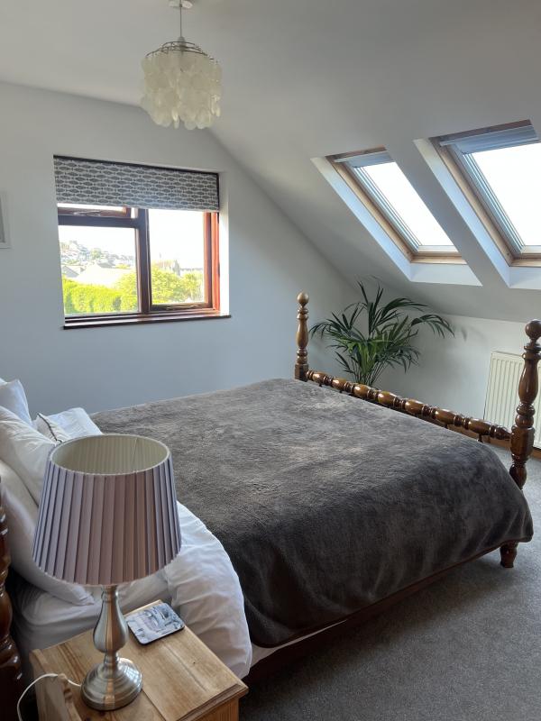 Dual aspect room with 3 Skylights, outlook over the village towards the harbour and countryside.