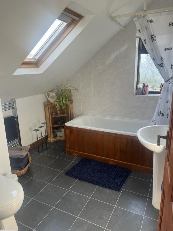 Closed WC , pedestal wash basin and bath with shower over. Towel rail, Partially tiled walls, skylight and obscured window to the south.
