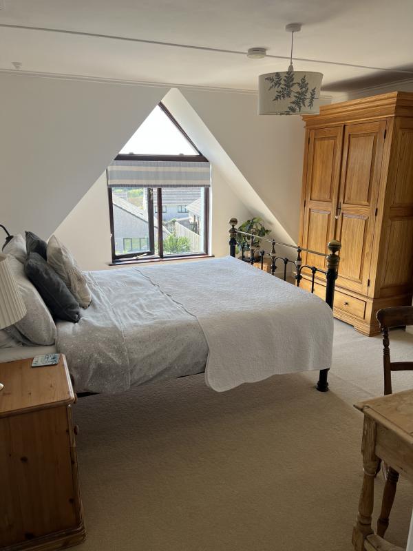 Irregular shaped room with views over the village, sea and countryside, inbuilt cupboard with hot water storage tank.