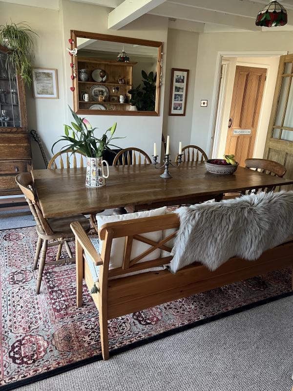 Beautiful bright room with beamed ceiling, door to inner hall and kitchen, and step down to sunroom, views looking over the village and countryside.