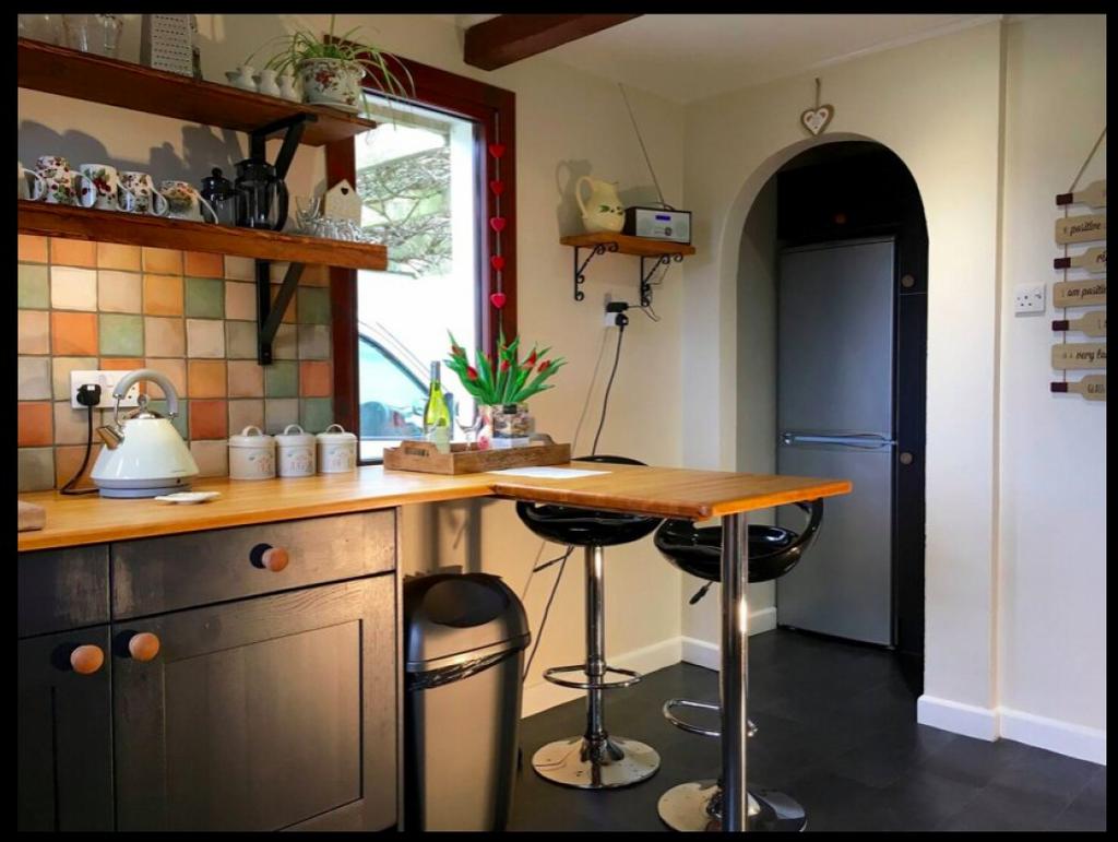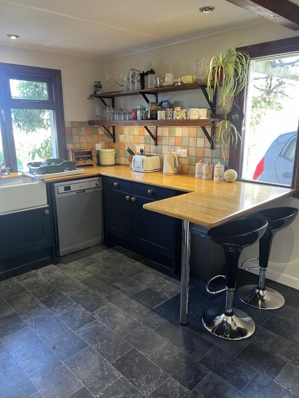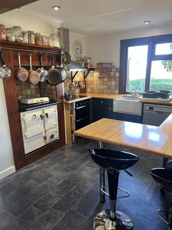 Wooden worktop with breakfast bar, Belfast sink, built in double oven with hob and hood over, space for dishwasher and fridge/freezer. Solid fuel stove with partially tiled walls.