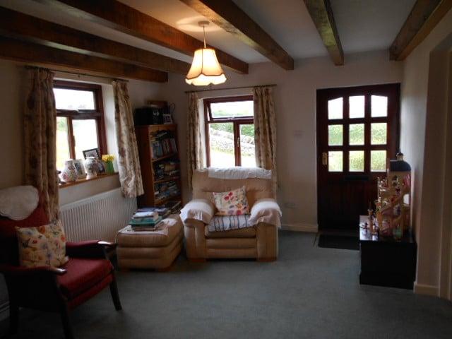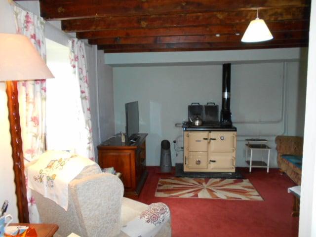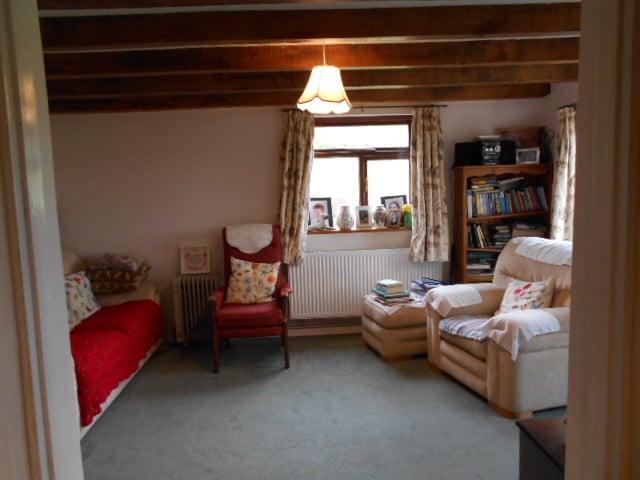 Approx. 15' 10" x 13' 0" (4.83m x 3.96m) Beamed ceiling. Stairs to first floor. Rayburn solid fuel stove. Window overlooking front garden. Storage space under stairs. Double doors to: -