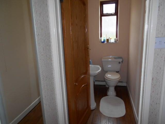 Pedestal wash basin and w.c. Fitted wall mounted mirror. Pull switch
