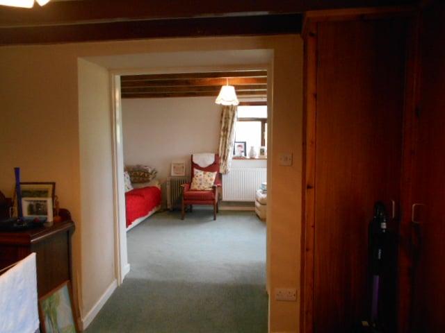 Approx. 9' 8" x 13' 0" (2.95m x 3.96m) Beamed ceiling. Fitted cupboard. Window overlooking front garden. Door to: -