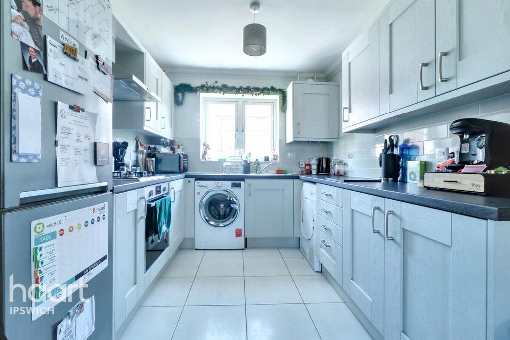 Upon entering the home, you are greeted by a spacious open-plan living and dining area, designed to create a warm and inviting atmosphere. Just off the ground floor hallway is a downstairs cloakroom fitted with a WC and basin, adding great practicality to the layout of this home. The layout flows seamlessly from the front of the house, with natural light pouring in through large windows that enhance the sense of space. The living area provides a comfortable place to relax and unwind with family and friends and offers access to a well-maintained rear garden. The kitchen is well-appointed, with modern fittings and sufficient storage space, providing the perfect spot for preparing meals. It includes an integrated oven and gas hob with a stainless steel extractor fan, as well as space for a washing machine and dishwasher.