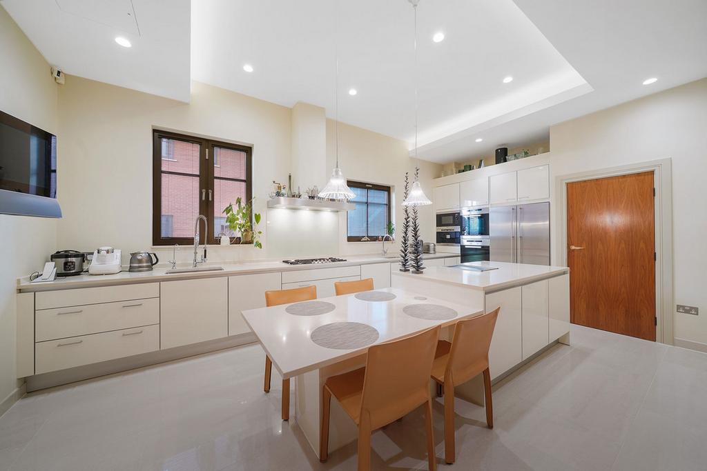 The apartment offers well-defined living and entertaining areas, including a generous reception room with dual aspect glazing that opens onto the wraparound terrace. All bedrooms feature built-in wardrobes and ensuite bathrooms, while the principal suite includes a private dressing area. Additional spaces include a separate formal dining room, eat-in kitchen, utility room, and guest WCs. Residents benefit from a concierge, CCTV, and secure parking.