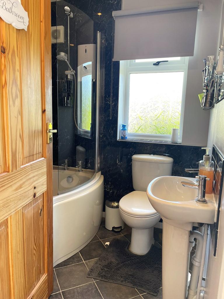 Obscure glazed window to rear. The bathroom is fitted with a white suite, comprising; WC with co-ordinating seat, pedestal wash hand basin with chrome taps and splashback. P shaped bath, with chrome taps, a glazed shower screen and a fitted Mira sport electric shower. Chrome ladder style heated towel rail.