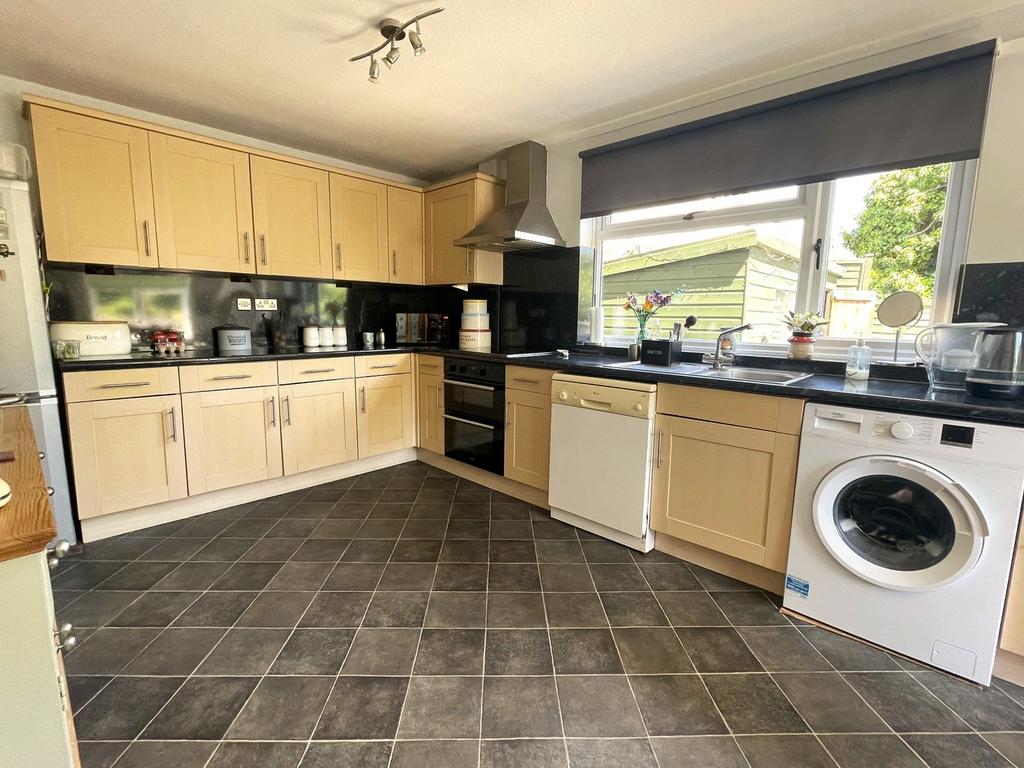 The kitchen has been fitted to two sides, with a range of matching wall and base units with co-ordinated handles. L shaped run of work surface with inset single bowl stainless steel sink and drainer with chrome mixer tap, with cupboards beneath including space and plumbing for washing machine and space and plumbing for dishwasher. Inset four ring electric hob, with extraction above and a fitted double oven beneath. Space for free standing fridge freezer.