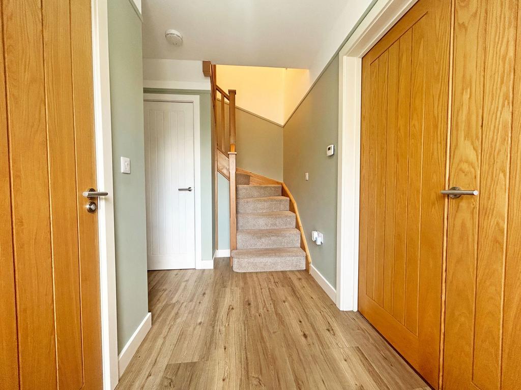 Entrance Hallway – Having staircase to the first floor landing, under stairs storage cupboard with spot lighting, central heating radiator, smoke alarm, 'Karndean' flooring, programmer and thermostat controls for the ground floor heating, oak double opening doors to the Lounge.