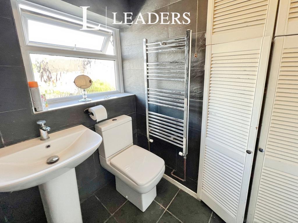 Bathroom - 1.61m x 1.93m (5'3" x 6'4") - Fitted with a modern three piece suite comprising bath with shower over, wash hand basin and a low-level WC, radiator, tiled flooring, storage cupboard