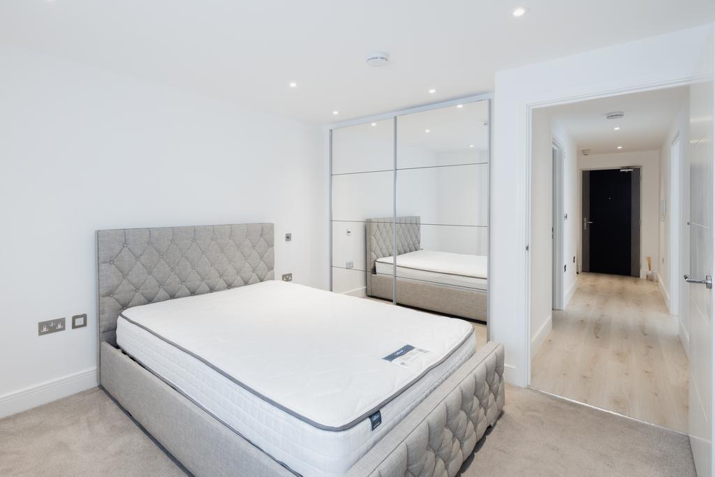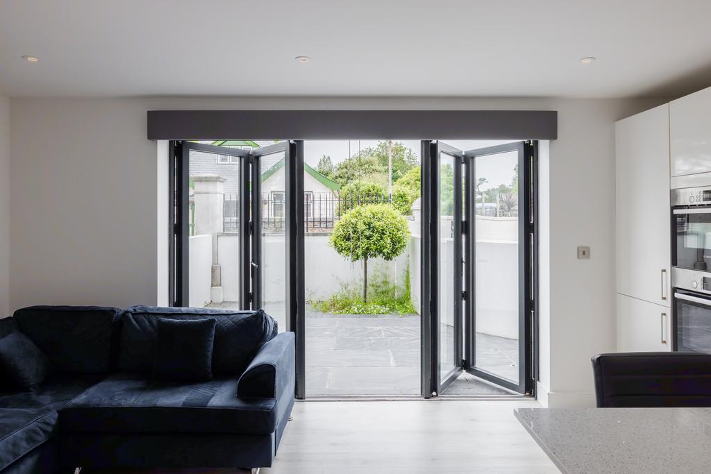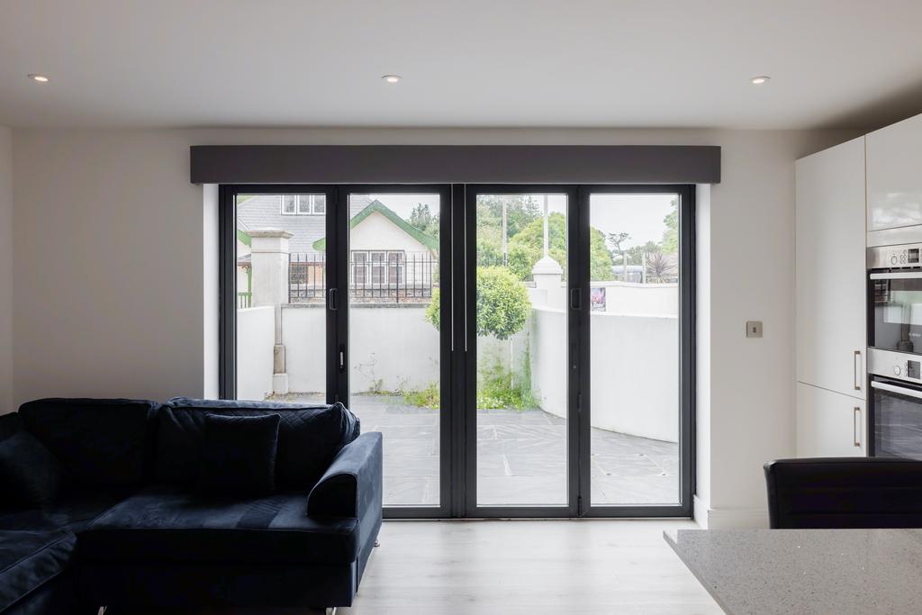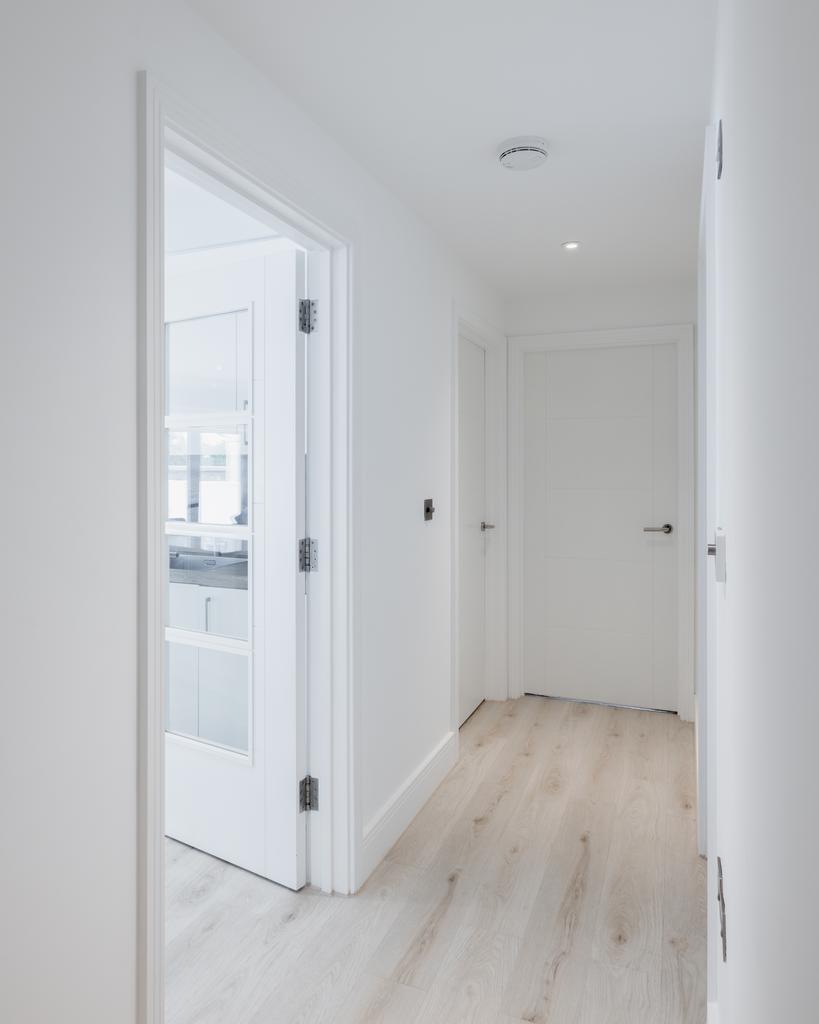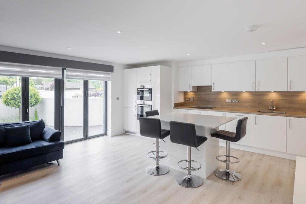 A communal hall leads to the apartment’s private entrance lobby, which contains a generous storage cupboard housing the utilities. The open-plan kitchen/living area features contemporary white units with built-in appliances, Corian worktops, wooden flooring and a feature island—large enough to serve as a dining table or entertaining space. Bi-fold doors open on to the terrace. The primary bedroom also enjoys terrace access and boasts an en-suite shower room. Bedroom 2, situated at the rear, benefits from an adjacent family bathroom with a bath and shower over.