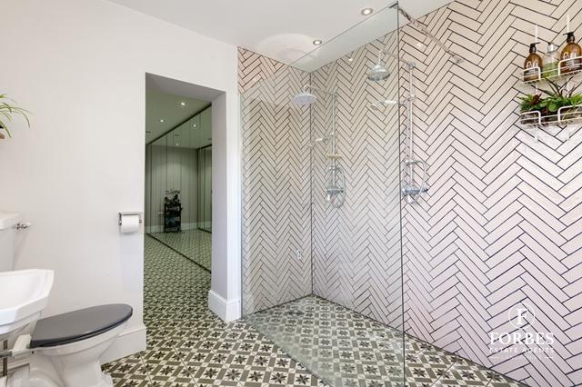 Also on the ground floor: A utility room with sink, worktop, additional storage cupboards, rear access door and plumbing for a washing machine and tumble dryer - Cloak/boot room with a handy bench, storage shelving & WC. Bedroom five (currently used as a study) with Art Deco fireplace. Double bedroom four, boasting a large bay window and traditional open grate fireplace and wood mantelpiece. The larger master suite (bedroom one) is a standout feature, offering a private balcony with bi-fold doors, a walk-in wardrobe area with full-height mirrored wardrobes, underfloor heating, and a luxurious 4-piece en-suite with a claw foot bathtub, double walk-in showers, underfloor heating and dual chandeliers.