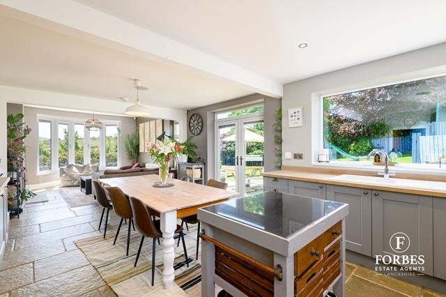 This exceptional residence is ideally located close to excellent schools, local amenities, and convenient motorway access via the M65, while also benefitting from a private and expansive side and rear gardens, and a sweeping concrete imprinted driveway suitable for multiple vehicles. Entering through the porch, you are welcomed into an L-shaped hallway that leads into the stunning open-plan kitchen/diner, the heart of the home, featuring stone flag flooring, an extensive range of units, range cooker, integrated appliances, and French doors opening onto the private patio. This opens into a spacious family lounge with a bay window and wood-burning stove, providing a warm, inviting ambiance with picturesque views.
