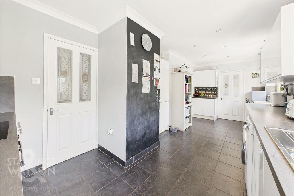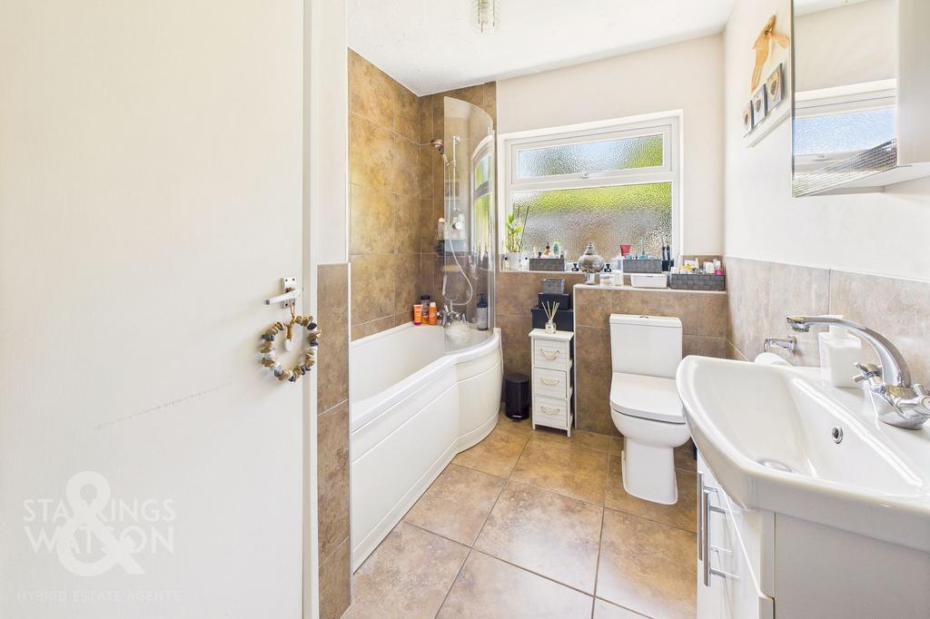 Once inside, tiled flooring runs underfoot with doors leading to the bedroom accommodation and living space, with a built-in cloaks cupboard sitting opposite. The main sitting room offers a front facing full height window with wood effect flooring underfoot, ample space for soft furnishings and a dining table with an opening take you to the kitchen/breakfast room. This spacious, light and bright room offers extensive built-in storage with integrated cooking appliances including an inset electric ceramic hob and built-in electric oven with glass splash-back and extractor fan above, matching up-stands running around the work surface, with tiled flooring underfoot, built-in breakfast bar, integrated fridge freezer and space for a washing machine. A door leads out to the rear garden with a further door taking you to the adjacent utility room offering space for laundry appliances. This versatile room offers built-in shelving, oil fired central heating boiler and uPVC double glazed French doors leading, out creating a versatile space which could be a home office or garden room if required. The bedroom accommodation are all finished with wood effect flooring underfoot and uPVC double glazing with the main bedroom sitting adjacent to the garage, offering potential to convert further space and create an ensuite if required (stp). Serving all three bedrooms is the family bathroom which has been updated to include a white three piece suite with storage under the hand wash basin, shaped panelled bath with a mixer shower tap, tiled splash-backs, heated towel rail, and built-in airing cupboard.