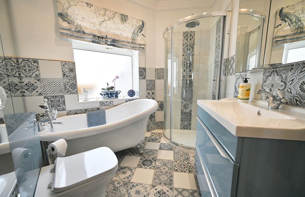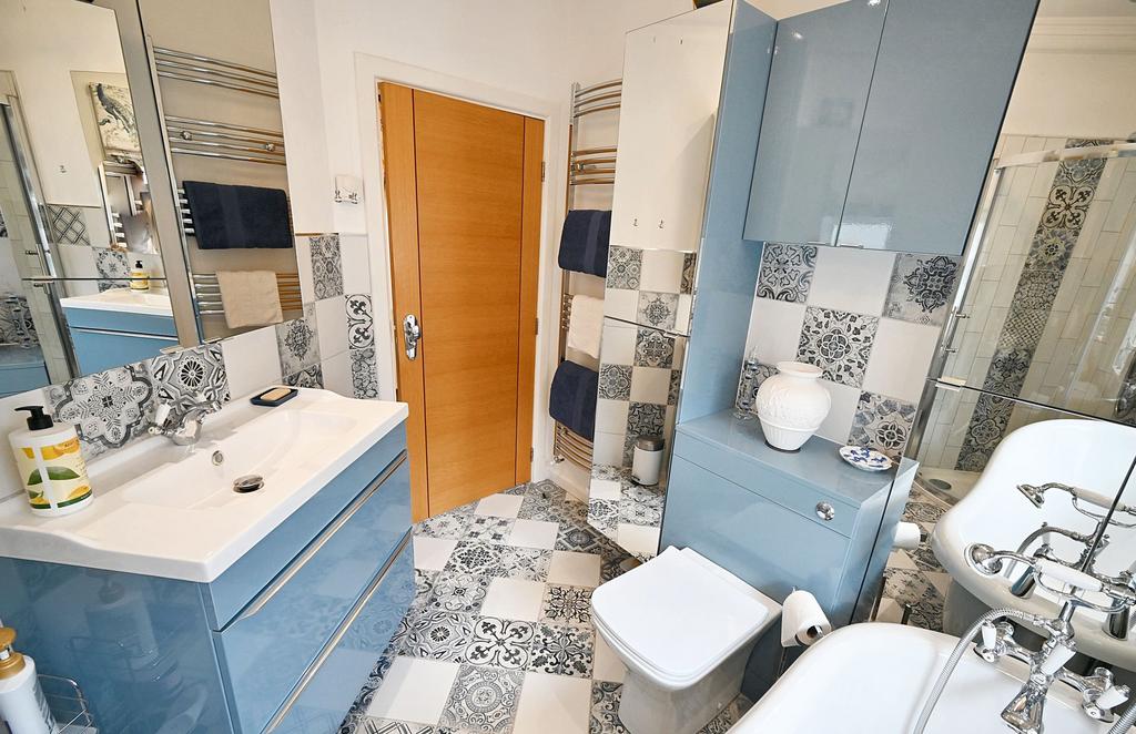 Bathroom: 9’3’’ (2.81m) x 8’4’’ (2.54m) Fitted with a superior white suite comprising roll top bath with chrome handheld spray, corner shower with chrome overhead rainfall shower & separate handheld spray, vanity unit with mirrored wall cabinet over, built in mirrored & gloss recessed storage units with recessed WC, chrome heated towel rail, patterned ceramic tiled flooring with underfloor heating, matching wall tiles, period style coved ceiling, recessed ceiling spot lights and double glazed opaque window to the side.